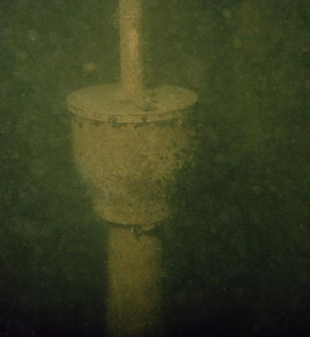 Aurinko paistaa nyt täydellä terällä ja meri on aivan tyyni. Päätämme yrittää katsoa VA-videolla, että missä kohtaa hylkyä naara on kiinni ja minkälainen näkyvyys hylyllä on. Pienten vaikeuksien jälkeen saamme videosysteemin kuntoon ja laskemme kameran naaraköyteen tehtyä lenkkiä pitkin alas. Olli hoitaa kaapelia ja laskee kameraa alemmas ja alemmas. Jyrki ja minä tuijotamme hytissä herkeämättä pintamonitoria ja ruudussa näkyvää naaraköyttä. Yht'äkkiä kuvaruudussa näkyy joku lieriö, jossa on kiinnittyneenä runsaasti simpukoita. - Pysäytä! Kiljumme yhtäaikaa. Esine liukuu pois näkyvistä. Olli nostaa kameraa hieman ylöspäin ja esine tulee uudestaan näkyviin. Tutkimme sitä hetken ja päättelemme sen olevan joku iso putki joka sojottaa pystyssä, ehkä katkennut masto. Kamera ei suostu laskeutumaan siitä alemmaksi. Järkeilemme että köysi on muodostanut mutkan putken ympäri. Pääasia, että saamme nähdä edes osan hylystä ja näkyvyyskin vaikuttaa hyvältä. Jätämme kameran alas, jotta voimme sitten hylyssä kuvata lisää. Sovimme että menen Jyrkin kanssa tutkimaan hylkyä.